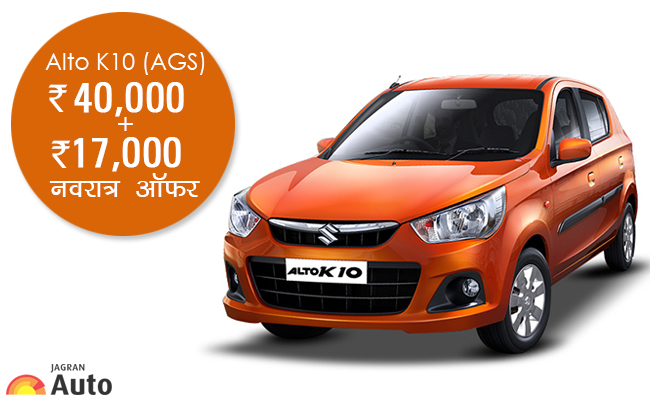 मारुति ऑल्टो K10 (AGS) मॉडल पर भी बढ़िया ऑफर दे रही है जी हां कार पर आप 40,000 रूपये तक की सेविंग कर सकते हैं। इतना ही नही बचा सकते है साथ ही स्पेशल 17,000 नवरात्र ऑफर भी आपको इस कार के साथ मिलेगा।