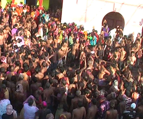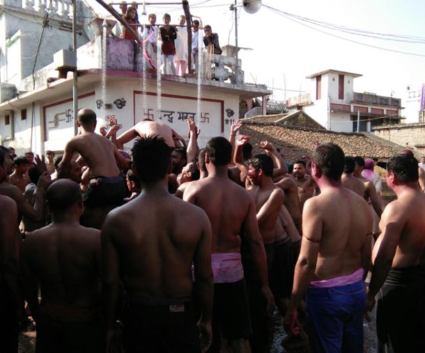 भगवती स्‍थान के पास इमारतों पर रंग-बिरंगे पानी के फव्वारे लगाए जाते हैं। इनके नीचे लोग एक-दूसरे के कंधों पर चढ़कर मानव श्रृंखला बनाते हैं। इस बीच जगह-जगह गांव के घरों के झरोखों से मां-बहनें रंग उड़ेलती हैं।