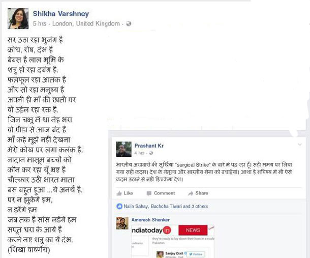 सात समंदर पास सिडनी (आस्ट्रेलिया) मेें रहकर भी रहकर भी मातृभूमि पर नजर रखे प्रशांत कुमार फेसबुक पर लिखते हैं, ''भारतीय अखबारों की सुर्खियां "surgical Strike" के बारे में पढ़ रहा हूं। सही समय पर लिया गया सही कदम। देश के नेतृत्व और भारतीय सेना को बधाईयां। आशा है भविष्य में भी ऐसे कदम उठाने से नहीं हिचकेगा देश।''
