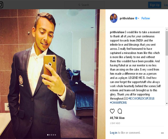 पृथ्वी शॉ ने U19 वर्ल्डर कप जीतने के बाद सोशल मीडिया पर अपनी एक तस्वीर साझा की है। अपने इंस्टाग्राम एकाउंट पर यह तस्वीर शेयर करते हुए कप्तान पृथ्वी ने लिखा है, ‘भारतीय टीम को सपोर्ट करने के लिए सभी फैंस का शुक्रिया’!! भारतीय अंडर-19 टीम की कप्तानी करना मेरे लिए बेहद खास रहा, यह टीम मेरे परिवार से कम नहीं, इन्हें भुलाना संभव नहीं है।’