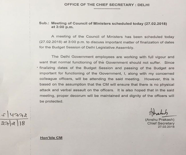 कैबिनेट मीटिंग से पहले मुख्य सचिव ने लिखा केजरीवाल को खत, पूछा- फिर तो नहीं होगी पिटाई