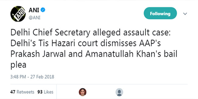 मंगलवार को याचिका पर सुनवाई करते हुए तीस हजारी कोर्ट ने कहा कि आरोप काफी गंभीर हैं इसलिए जमानत नहीं दी जा सकती है। हालांकि याचिका में दलील दी गई थी कि हाल ही में प्रकाश जारवाल की शादी हुई है, ऐसे में उनको जमानत दे दी जानी चाहिए। इस पर कोर्ट ने कहा कि हाल ही में शादी होने के बाद भी जमानत नहीं दी जा सकती है, क्योंकि 56 वर्ष के अंशु प्रकाश के साथ जिस तरह से मारपीट की गई है वह काफी गंभीर है। ये दूसरी बार है जब कोर्ट ने मुख्य सचिव से मारपीट करने के मामले में जमानत याचिका खारिज की है। वहीं अब आरोपी दोनों विधायकों के वकील हाई कोर्ट में नए सिरे से जमानत की अर्जी लगाएंगे।