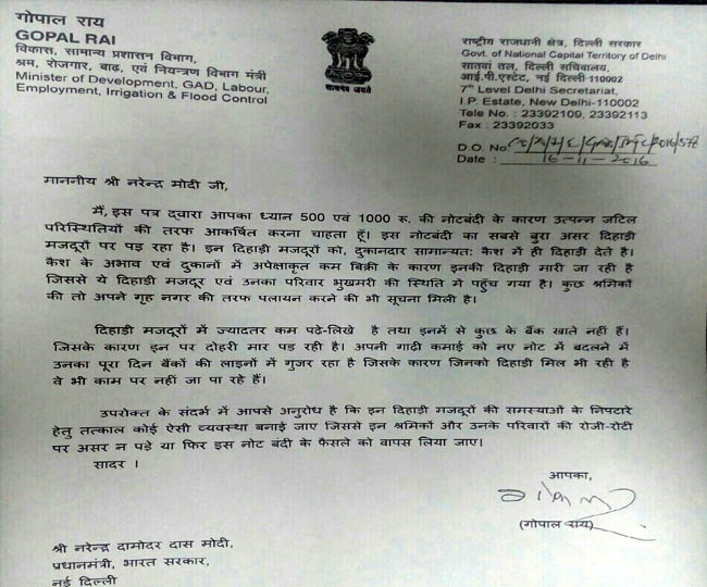 दिल्ली सरकार में मंत्री गोपाल राय ने लिखा पीएम नरेंद्र मोदी को खत लिखकर कहा है कि नोटबंदी से मजदूरों के सामने संकट खड़ा हो गया है।