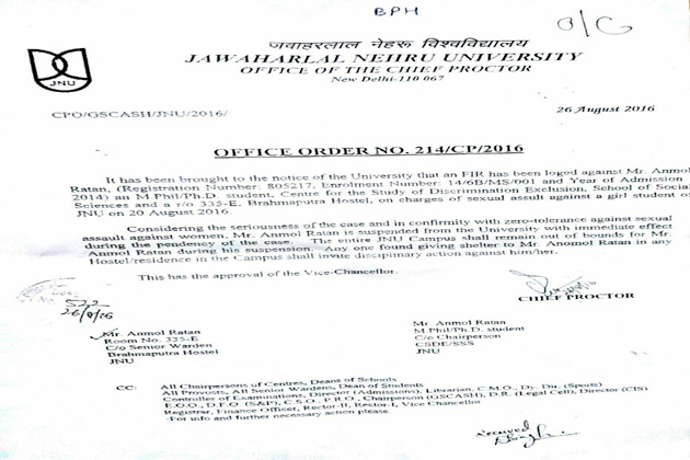 अनमोल रतन JNU से निलंबित, जांंच पूरी होने तक प्रवेश पर लगी पाबंदी