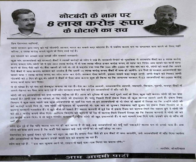 आम आदमी की तरफ से जारी किए पर्चे में लिखा है कि नोटबंदी के जरिए 8 लाख करोड़ रुपये का घोटाला किया गया है जो आजाद भारत का सबसे बड़ा घोटाला है। केजरीवाल ने आरोप लगाया कि अरबपतियों के कर्ज माफ करने के लिए केंद्र सरकार ने नोटबंदी का फैसला लागू किया है।