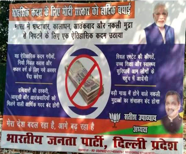 नोटबंदी को लेकर सियासत जारी है। भाजपा ने पोस्टर के जरिए नोटबंदी के फैसले को देशहित में बताया है। दिल्ली भाजपा ने बड़े-बड़े होर्डिंग दिल्ली के अलग अलग स्थानों पर लगवाए हैं। पीएम मोदी के साथ दिल्ली भाजपा अध्यक्ष सतीश उपाध्याय के फोटो वाले इन पोस्टरों में नोटबंदी के बाद होने वाले फायदों को सिलसिलेवार तरीके से लिखा गया है।