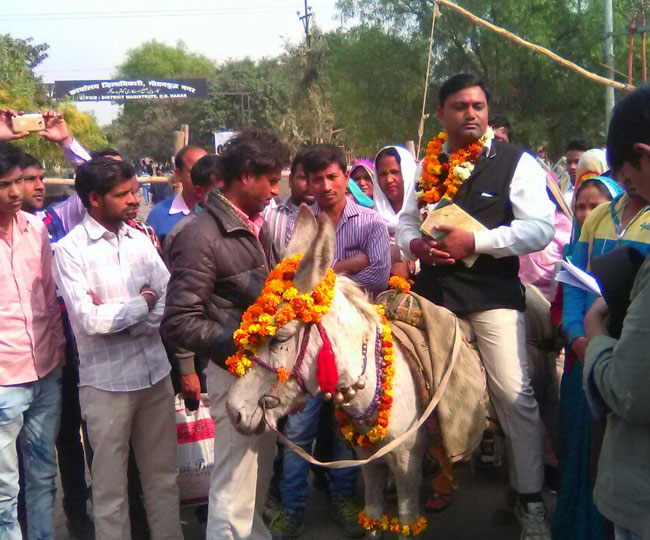 यूपी चुनाव 2017 : गधे पर सवार होकर नामांकन के लिए पहुंचे नेताजी