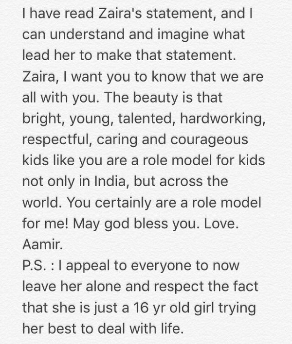 आमिर -" मैं समझ सकता हूं कि किस मनःस्थिति में ज़ायरा को इस तरह का बयान देने की जरुरत क्यों पड़ी। ज़ायरा , हम सब तुम्हारे साथ हैं । "