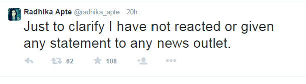 दरअसल, एक वेबसाइट ने दावा किया था कि राधिका आप्टे ने अपनी न्यूड वीडियो क्लिप पर टिप्पणी की है। वेबसाइट के मुताबिक राधिका ने कहा, 'मैंने इस न्यूड वीडिया क्लिप को देखा और मुझे हंसी आ गई, ये असल में बहुत फनी है। मैं इन दिनों काफी व्यस्त हूं और इन बातों में अपना कीमती समय बर्बाद नहीं करना चाहती। मुझे और मेरे परिवार को ऐसी चीजों से कोई फर्क नहीं पड़ता। इसलिए मैं इस 'न्यूड वीडियाे' के लीक होने से बिल्कुल भी परेशान नहीं हूं।'