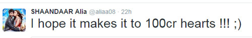 दरअसल, इस फिल्म का फर्स्ट लुक जारी किए जाने के बाद आलिया भट्ट से उनके एक फैन ने ट्वीट कर पूछा था कि क्या उनकी फिल्म 'शानदार' 100 करोड़ के क्लब में शामिल हो पाएगी, इस पर उन्होंने ये बहुत ही 'शानदार' जवाब दिया था।