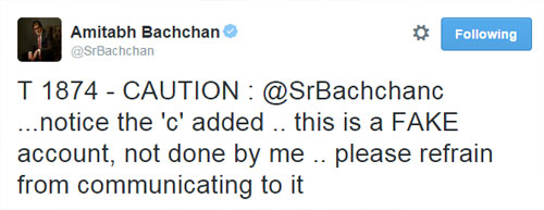 अमिताभ बच्चन के नाम से टि्वटर पर कई फर्जी अकाउंट हैं। हाल ही उनकी फिल्म 'पीकू' रिलीज हुई थी, जो धमाकेदार कमाई करते हुए 100 करोड़ के क्लब में शामिल हो गई है। इस फिल्म में उनके अलावा दीपिका पादुकोण और इरफान खान भी मुख्य भूमिकाओं में हैं। इसकी सफलता को देखकर तीनों कलाकार बेहद खुश हैं।