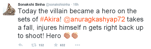 सोनाक्षी ने ट्वीट किया, 'आज आकिरा के सेट पर विलेन हीरो बन गया। अनुराग कश्यप गिर गए और खुद को घायल कर लिया लेकिन शूट पर लौट आए। हीरो।'