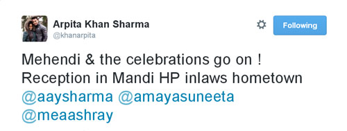उन्होंने ट्विटर पर अपने पैरों में लगी महंदी की तस्वीर पोस्ट की। अर्पिता ने इसके साथ ट्वीट किया, 'महंदी और सेलिब्रेशन चल रहा है। हिमाचल प्रदेश के मंडी ससुराल में रिसेप्शन।'