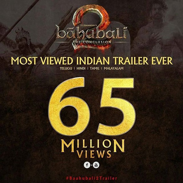 जी हाँ , एस एस राजमौली स्टारर फिल्म बाहुबली - द कंक्लूजन के वीडियो (ट्रेलर) ने 24 घंटे के भीतर देखे जाने का नया रिकॉर्ड बना लिया है। दुनिया भर में किसी वीडियो को 24 घंटे के भीतर देखे जाने में बाहुबली का ट्रेलर सातवें नंबर पर आ गया है। कुल व्यूव्ड आंकड़ों में बाहुबली ने 65 मिलियन यानि साढ़े छह करोड़ का आंकड़ा पहले ही पार कर लिया था और इस ट्रेलर ने अब यू ट्यूब में 13 स्थान से जम्प लेकर सातवां स्थान हासिल कर लिया है। आइये आपको पूरी यू ट्यूब पर सबसे ज़्यादा देखे गए वीडियो की लिस्ट बताते हैं -