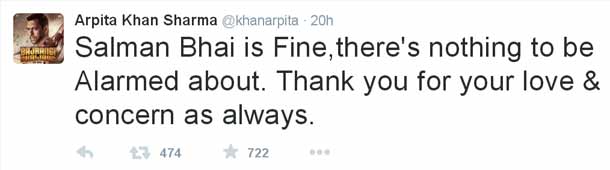 अर्पिता ने ट्विटर पर इसकी जानकारी दी। उन्होंने ट्वीट किया, 'सलमान भाई ठीक हैं। चिंता की कोई बात नहीं है। आपके प्यार और फिक्र के लिए शुक्रिया।'