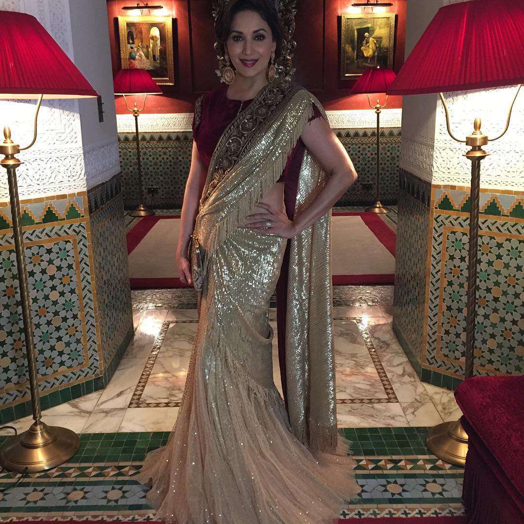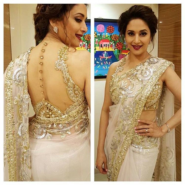 वाइट नेट और गोल्डन वर्क की इस साड़ी में माधुरी की अदाओं का क्या कहना! बैक-लेस्ट नेट वर्क के साथ उनका गोल्डन ब्लाउज भी काफ़ी खुबसूरत है। उनका लूज़ मेस्सी बन और डार्क लिपस्टिक तो किसी का भी दिल धड़का सकती है।