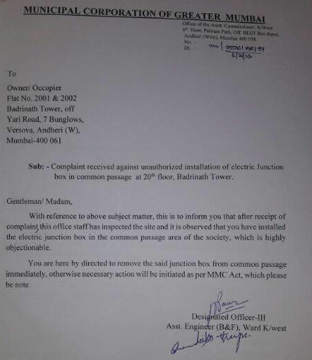 6 अप्रैल को जारी किये गए इस नोटिस में अनुष्का से बिल्डिंग के कॉमन पैसेज से इस इलेक्ट्रिक जंक्शन बॉक्स को हटाने के लिए कहा गया है। अगर वो ऐसा नहीं करती तो MMC की तरफ़ से उनपर कार्यवाई की जाएगी। वैसे, अनुष्का की तरफ़ से अब तक कोई जवाब नहीं आया है।