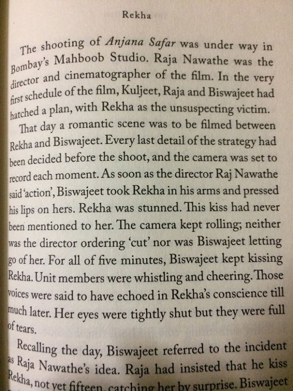 किताब में दावा किया गया है कि जैसे ही डायरेक्टर ने एक्शन बोला, विश्वजीत ने रेखा को अपनी बाहों में लिया और किस करने लगे. रेखा सकपका गईं क्योंकि उन्हें इसके बारे में कुछ पता ही नहीं था। सीन पूरा होने तक विश्वजीत ने रेखा को पकड़े रखा था। सेट के लोग खुश हो कर सीटियां मार रहे थे लेकिन रेखा की आंखों से सिर्फ आंसू निकल रहे थे। बाद में जब इस घटना के बारे में विश्वजीत से पूछा गया था उन्होंने कहा था कि वो सीन उनके इन्जॉयमेंट के लिए नहीं बल्कि फिल्म का हिस्सा था और आइडिया डायरेक्टर का था। रेखा को बुरा लगा क्योंकि उन्हें इसके बारे में बताया नहीं गया था।