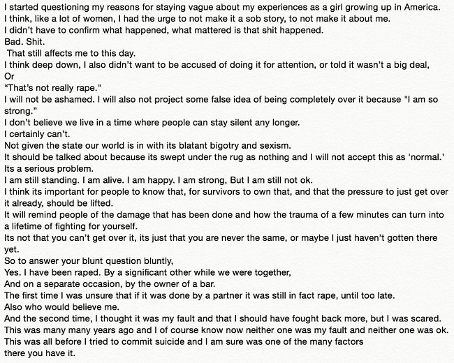 एक मैग्जीन को भेजे गए ई- मेल में 29 साल की फेमस टेली सीरीज़ ' वेस्टवर्ल्ड ' एक्ट्रेस वुड ने बताया है कि उन्हें अपने जीवन में मानसिक , शारीरिक और सेक्सुअल एब्यूज का शिकार होना पड़ा है। वुड ने बताया है कि दो अलग अलग मौकों पर उनका रेप किया गया। उन्होंने बताया कि एक बार उन्हें उस ख़ास व्यक्ति ने इस हादसे का शिकार बनाया जब उनके उस व्यक्ति से रिश्ते थे और एक बार एक बार के मालिक ने उनके साथ रेप किया था। वुड के मुताबिक इन दोनों हादसों के बाद उन्होंने आत्महत्या करने की भी कोशिश की थी। उस समय वो 22 साल की थीं और उनका मैरीलीन मेंसन के साथ ऑन-एंड-ऑफ रिलेशनशिप था। वुड ने लिखा है कि उन्हें विश्वास ही नहीं होता कि आज के समय में कोई लंबे समय तक चुप कैसे रह सकता है। वुड ने कहा है कि आज भी वो मजबूत हैं , ख़ुश है , जीवित है लेकिन पूरी तरह ठीक नहीं हैं। लगता है लोगों को इस बारे में जानना बेहद जरुरी है ताकि कुछ बोझ कम हो। इवान रचेल वुड ने अपने साथ हुए हादसे के बारे में ट्विटर पर भी एक ओपन लेटर लिखा है जिसे आप यहां पढ़ सकते हैं -
