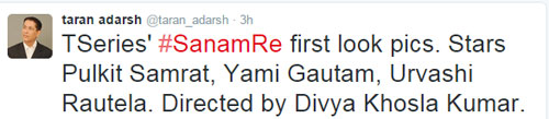 नई दिल्ली। टी-सीरीज की अगली फिल्म 'सनम रे' का फर्स्ट लुक जारी कर दिया गया है। दिव्या कुमार खोसला द्वारा निर्देशित इस फिल्म फिल्म में पुलकित सम्राट, यामी गौतम और उर्वशी रॉटेला लीड रोल में हैं। इस फिल्म में ऋषि कपूर भी सपोर्टिंग रोज में दिखेंगे।