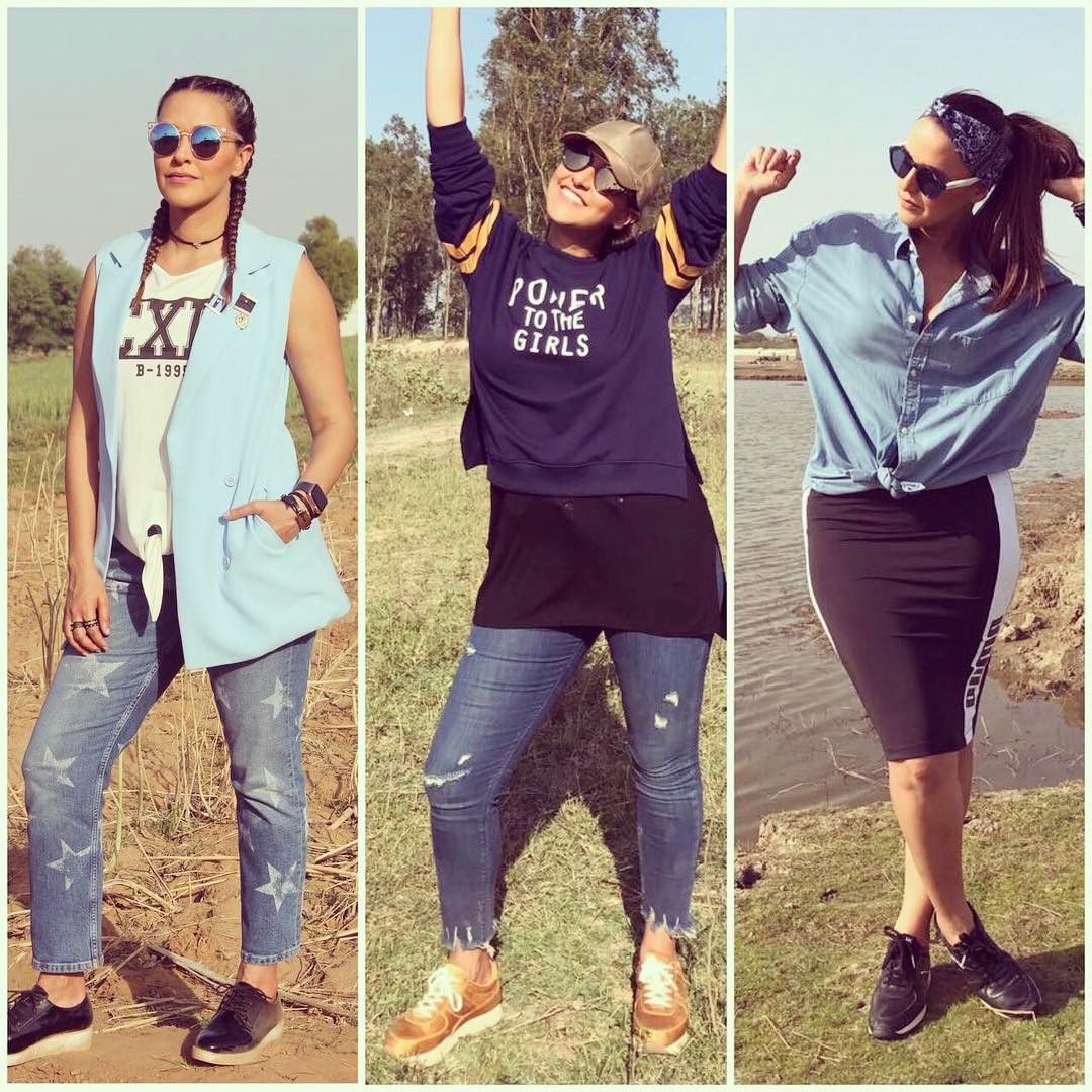 नेहा का डेनिम लव तो काफ़ी गहरा लगता है। नेहा ने इस तस्वीर में तीन अलग अलग तरीके से डेनिम को कैरी किया है। स्टार प्रिंटेड डेनिम जीन्स के साथ लाइट डेनिम जैकेट, रिग्ड डेनिम लूज़ जीन्स और हमारा फेवेरेट शोर्ट डेनिम टायिंग शर्ट!