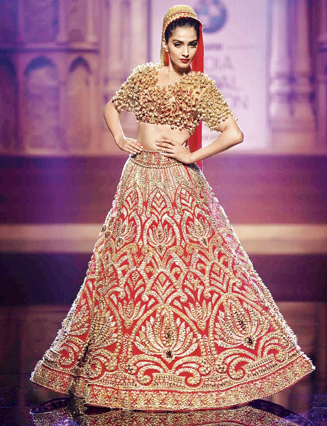संदीप खोसला के इस ब्राइडल कलेक्शन को पेश करती हुई सोनम कितनी ख़ूबसूरत लग रही हैं न? रेड एंड गोल्डन का हैवी लहंगा और हैवी गोल्डन वर्क का ब्लाउज़ और इस ऑउटफिट का सबसे बेस्ट पार्ट है इसका दुपट्टा जिसे सोनम ने सर पर हाई बन के साथ कैरी किया है।