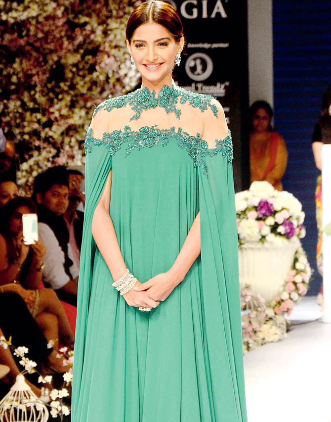 मिशैल कोसैलो के इस ग्रीन लॉन्ग ऑउटफिट को पहने जब सोनम IIJW के रैम्प पर चली तो सबकी निगाहें इन्ही पर टिक गईं थी। लाइट मेकअप, मिडिल पार्टेड स्लीक पोनी टेल...wow!
