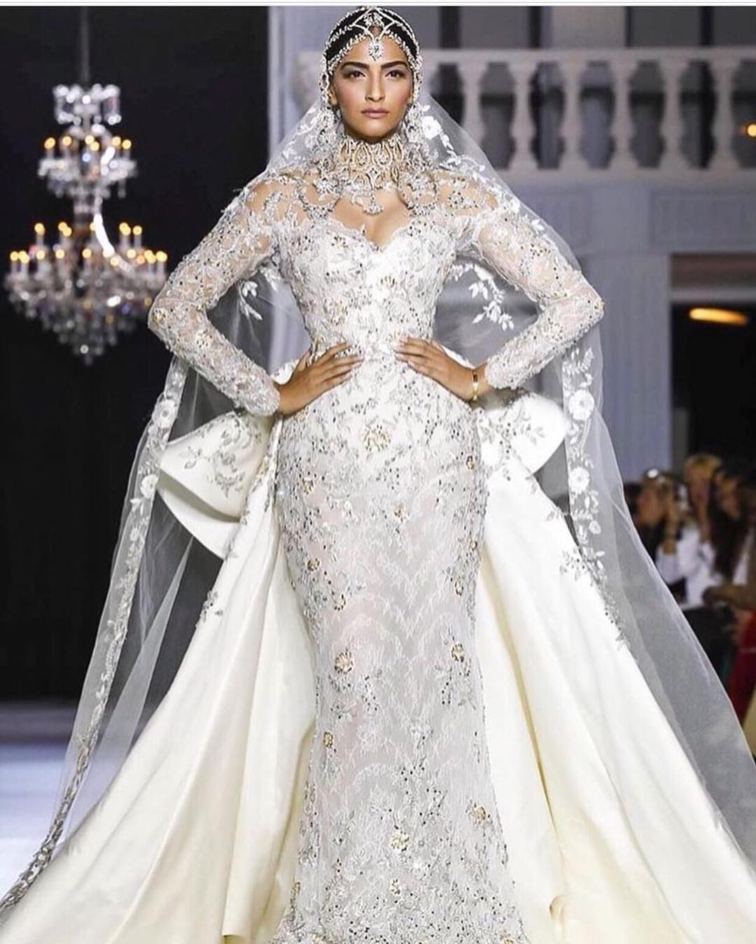 यह है सोनम का लेटेस्ट रैम्प वाक लुक, राल्फ एंड रूसो के इस सिल्वर वाइट ऑउटफिट को सोनम ने वाइट नेट लॉन्ग दुपट्टा और सिल्वर असेसरिज़ के साथ मैच किया है।