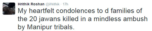 नई दिल्ली। बॉलीवुड एक्टर रितिक रोशन मणिपुर में आतंकवादी हमले पर ट्वीट कर विवादों में फंस गए हैं। उन्होंने ट्वीट कर इस हमले में 20 जवानों की मौत की निंदा की। उन्होंने लिखा कि मणिपुर आदिवासियों द्वारा हमले में मारे गए 20 जवानों के परिवारों के प्रति हार्दिक संवेदना व्यक्त करता हूं। ये रहा उनका ट्वीट।