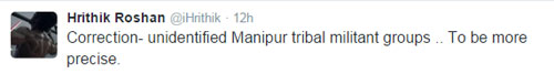 इस ट्वीट में रितिक रोशन का उग्रवादी समूह की जगह 'मणिपुर के आदिवासी' लिखना किसी को भी रास नहीं आया और फिर क्या, ट्विटर पर उनकी आलोचना शुरू हो गई। हालांकि उन्होंने थोड़ी देर में अपनी गलती सुधार ली और दोबारा ट्वीट किया।