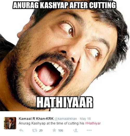 अब यह फिल्म रिलीज हो चुकी है और बॉक्स ऑफिस पर यह फ्लॉप भी साबित हो गई है। ऐसे में कमाल आर खान ने ट्विटर पर अनुराग कश्यप को नपुंसक भी बना डाला है ! दरअसल, उन्होंंने ट्विटर पर अनुराग कश्यप की एक तस्वीर पोस्ट की है, जिसमें वह चीखते-चिल्लाते नजर आ रहे हैं। इसके साथ ही उन्होंने लिखा है, 'नपुंसक बनाते समय अनुराग कश्यप की यह तस्वीर।'