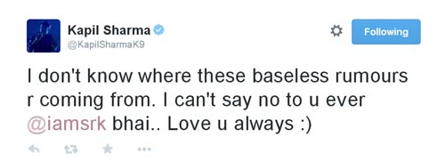 हालांकि अब कपिल ने इन खबरों पर अपनी सफाई दी है। उन्होंने ट्विटर पर कहा कि ये महज अफवाहें हैं और वो शाहरुख के शो के लिए कभी ना नहीं कह सकते। उन्होंने ट्वीट किया, 'मुझे नहीं पता कि ये निराधार अफवाहें कहां से आ रही हैं। मैं शाहरुख भाई के लिए कभी न नहीं कह सकता। मैं आपसे हमेशा प्यार करता हूं।'
