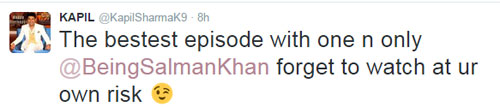 उन्होंने ट्वीट कर इसे बेस्ट एपिसोड करार दिया है। ये रहा उनका ट्वीट और सलमान खान के साथ उनकी फोटो।