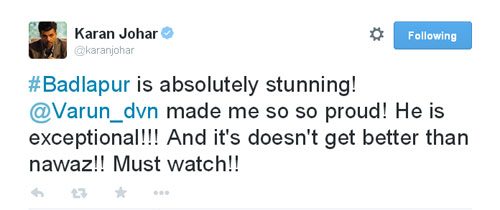 करण जौहर ने वरुण की तारीफों के पुल बांधे हैं। फिल्म के लिए उत्साहित करण ने ट्वीट किया, 'बदलापुर अद्भुत है। वरुण धवन ने मुझे बहुत गर्वित किया है। वो असाधारण हैं। और नवाज से बेहतर इसमें कोई नहीं हो सकता। जरूर देखें।'