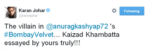 करण इस फिल्म में पहली कैजाद खमबट्टा नाम के विलेन का किरदार निभा रहे हैं। करण ने ट्वीट किया, 'अनुराग कश्यप की बॉम्बे वेलवेट का विलेन, कैजाद खमबट्टा, जिसे मैं निभा रहा हूं।' अभी तक कई फिल्मों में कैमियो कर चुके करण जौहर पहली बार किसी फिल्म में बेहद अहम किरदार निभा रहे हैं।