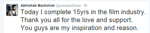 आज इस सफर के 15 साल पूरे हो गए हैं और इस खास मौके पर दोनों ही काफी खुश और भावुक भी हैं। अभिषेक बच्चन ने टि्वटर पर प्यार और सपोर्ट के लिए अपने फैंस का शुक्रिया अदा किया। ये रहा उनका पूरा ट्वीट।
