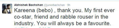 इसके साथ ही अभिषेक बच्चन ने एक और ट्वीट कर अपनी पहली को-स्टार करीना कपूर का भी शुक्रिया अदा किया और कहा कि वो हमेशा उनकी पसंदीदा को-स्टार बनी रहेंगी।