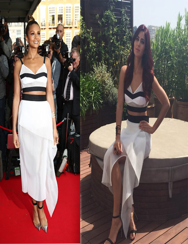 दरअसल फ्रेंच रिविएरा पहुंचने के बाद कट्रीना ने मीडिया इंटर्व्यू के लिए मिल्की स्प्रिंग 2015 मेश ब्लैक और वाइट क्रॉप टॉप के साथ मेश कासकेड मिनी स्कर्ट पहनी थी। कट्रीना ने अपने ट्विटर हैंडल पर अपनी फोटोज भी पोस्ट की लेकिन हाल ही में कुछ इसी तरह की ड्रेस सिंगर अलीशा डिक्सन भी पहने नजर आईं थी। अलीशा ने ये ड्रेस ब्रिटेन्स गॉट टैलेंट के लंदन ऑडिशन्स में पहनी थी।