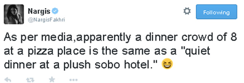 दरअसल, नरगिस और देव की एक साथ डिनर करने की तस्वीरें सामने आने के बाद दोनों के बीच रोमांस की चर्चा होने लगी। इससे परेशान होकर नरगिस को ट्विटर पर सफाई देनी पड़ी और बताना पड़ा कि वह देव के साथ अकेले नहीं गई थीं डिनर पर।