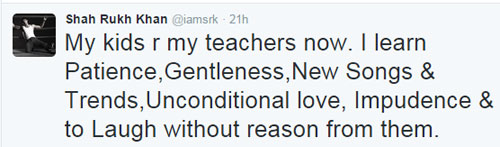 गौरतलब है कि शाहरुख खान ट्विटर पर काफी सक्रिय रहते हैं और अपने बच्चों से जुड़ीं तस्वीरें और किस्से भी ट्वीट कर साझा करते रहते हैं। उनकी आने वाली फिल्मों में 'दिलवाले', 'फैन' आैर 'रईस' शामिल हैं।