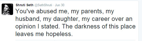 ऐसे में श्रुति सेठ ने ट्वीट कर लिखा, 'तुमने मेरी सोच के लिए मुझे, मेरे पैरंट्स, मेरे पति, मेरी बेटी, मेरे करियर को गाली दी। इस जगह का ऐसा हाल मुझे निराश करता है।'