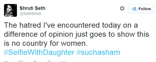 प्रधानमंत्री नरेंद्र मोदी के 'सेल्फी विद डॉटर' अभियान पर सवाल उठाकर एक्ट्रेस श्रुति सेठ मुश्किल में फंस गईं और अंत में थक कर उन्हें कहना ही पड़ा कि यह देश महिलाओं के लिए है ही नहीं। इसकी वजह से वह टि्वटर ट्रॉल्स का शिकार हो गईं और इस अभियान के