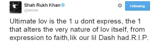 शाहरुख का यह कुत्ता बीमार था। उन्होंने ट्वीट किया कि वाकई में प्यार ऐसी चीज है, जिसे आप जाहिर नहीं कर सकते। साथ ही उन्होंने डैश के प्रति श्रद्धांजलि भी व्यक्त की।