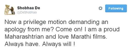 शोभा डे ने एक अन्य ट्वीट में लिखा, 'मुंबई के मल्टीप्लेक्स में पॉपकोर्न अब और नहीं? सिर्फ दही मीसल और वडा पाव। प्राइम टाइम में मराठी मूवी के साथ यही बेहतर होगा।' उनके इन ट्वीट को लेकर ही शिवसेना के एक विधायक ने विधानसभा में उनके खिलाफ विशेषाधिकार हनन का प्रस्ताव रख दिया, जिसपर उन्हें नोटिस जारी कर दिया गया।