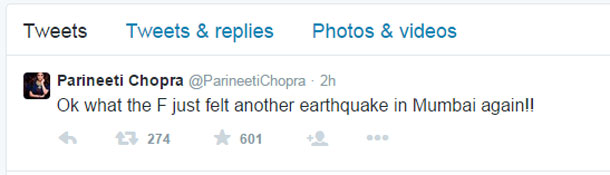 परिणीति ने भूकंप के झटके महसूस करने के बाद माइक्रो ब्लॉगिंग साइट पर ट्वीट किया। उन्होंने ट्वीट में लिखा, 'मैंने अभी मुंबई में भूकंप के झटके महसूस किए।'