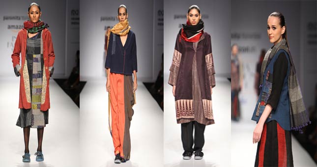 इस पूरे कलेक्शन को हाथों से बनाकर तैयार किया गया। रैंप पर मॉडल्स ने इक्कत पलाजो पैंट, क्विल्टेड रिवर्सिबल जैकेट जैसे परिधान पहनकर वॉक किया। कुर्तों और जैकेट में काफी पैचवर्क का इस्तेमाल किया गया था और खादी फैब्रिक उसे परफेक्ट लुक दे रहा था।