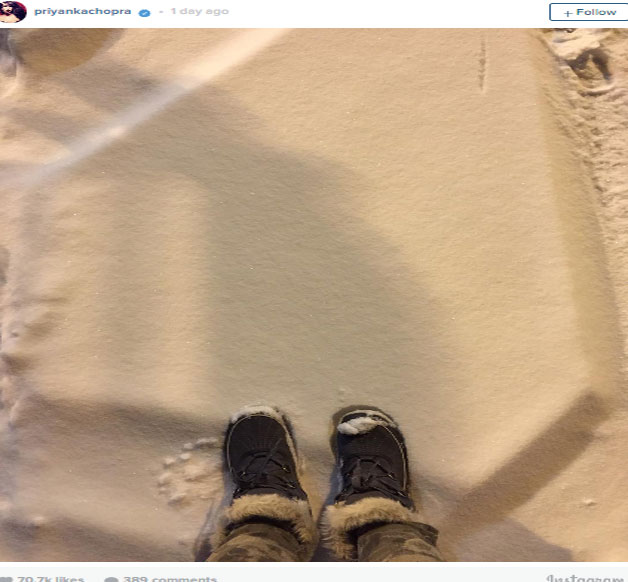 फिलहाल प्रियंका इस वक्त विदेश में सर्दियों का आनंद उठा रही हैं। उन्होंने इंस्टाग्राम पर अपनी एक सेल्फी के साथ फैंस से ये बात शेयर की है, जिसमें बर्फबारी होते हुए दिख रही है। ये उनके लिए साल की पहली बर्फबारी है। इस सेल्फी के साथ प्रियंका ने लिखा, 'बर्फबारी के कारण मेरी नाक और पलकें जम सी गई हैं। साल की पहली बर्फबारी है।'