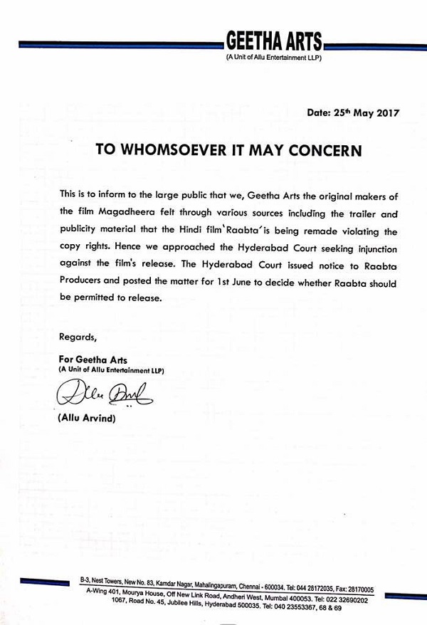 गीता आर्ट्स नामक बैनर के फिल्म बनाने वाले निर्माता अलु अरविन्द ने अपने बयान में कहा है कि गीता आर्ट्स ही मगधीरा की ओरिजनल निर्माता है और हिंदी फिल्म राब्ता के ट्रेलर और पब्लिसिटी मटेरियल देखने के बाद यह पाया गया है कि राब्ता ने कॉपी राइट्स कानून का उल्लंघन किया है। इसलिए हमने हैदराबाद हाईकोर्ट में फिल्म राब्ता के रिलीज़ के खिलाफ एक अर्जी दाखिल की थी। हैदराबाद हाईकोर्ट ने राब्ता के निर्माता को नोटिस भेजा है और इस मामले की सुनवाई एक जून को होगी।
