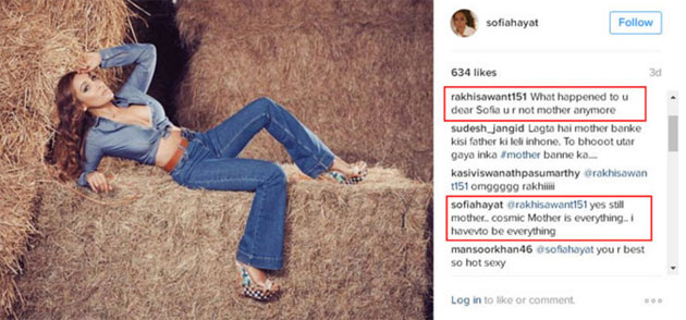 दरअसल, हाल ही में सोफिया ने इंस्टाग्राम पर एक ऐसी तस्वीर पोस्ट की, जिसमें उनके शरीर का उपरी हिस्सा झलक रहा था। इस पर ही कमेंट करते हुए राखी ने पूछ लिया, 'तुम्हें क्या हो गया है डियर सोफिया, क्या तुम अब मदर नहीं रहीं?’ इस पर सोफिया ने बहुत अजीब जवाब दिया। उन्होंने लिखा, 'मैं अब भी मदर हूं। कॉस्मिक मदर सबकुछ होती है…मुझे सबकुछ करना पड़ता है।’ अब इसका क्या मतलब निकाला जाए? खैर, आपको बता दें कि सोफिया ने कुछ दिनों पहले 'ब्रा' में भी अपनी तस्वीर शेयर की थी। ये रहा उनका पोस्ट, जिस पर राखी ने कमेंट किया।