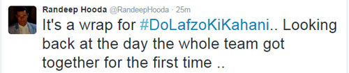 रणदीप हुड्डा की अगली फिल्म 'दो लफ्जों की कहानी' की शूटिंग पूरी हो गई है। दीपक तिजोरी निर्देशित इस फिल्म की शूटिंग के लिए पूरी कास्ट एंड क्रू कुआलालंपुर में थी। रणदीप हुड्डा ने ट्वीट कर शूटिंग पूरी होने की जानकारी दी है।